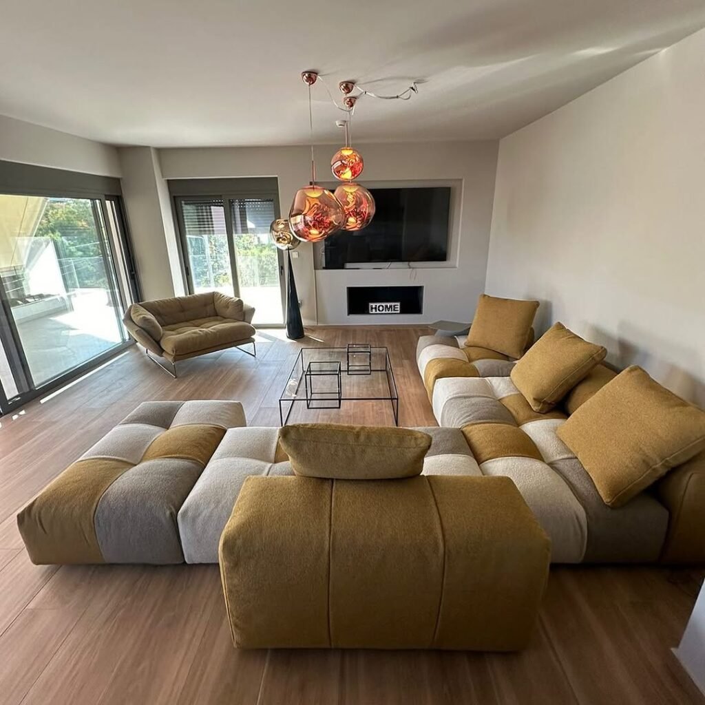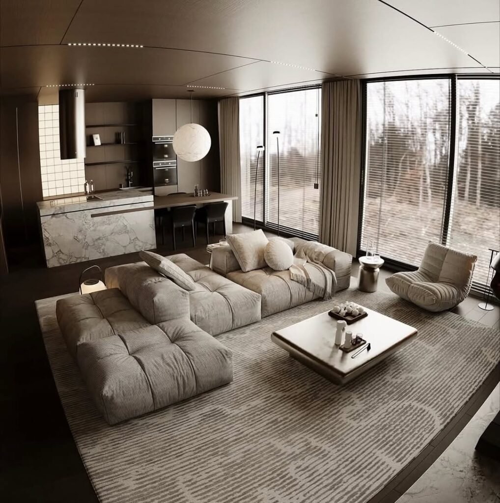 - Balance the visual weight: Heavy sofas need a light counterpart. Pairing a chunky, plush sectional with such a slender, architectural table creates a dynamic contrast, proving you don’t need a bulky centerpiece to anchor a large seating area.