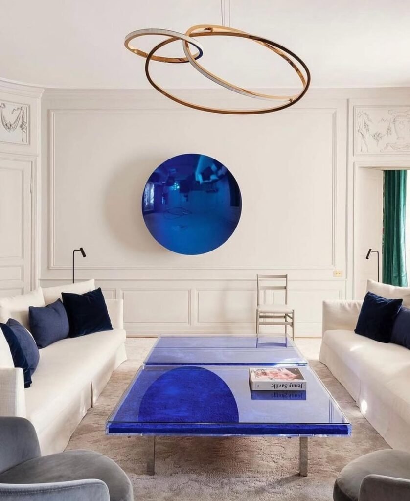 - Balance with symmetry: Chaos needs order. Flanking the loud, modern table with identical white sofas and matching black reading lamps provides a quiet, structured backdrop that allows the blue centerpiece to shine without fighting for attention.