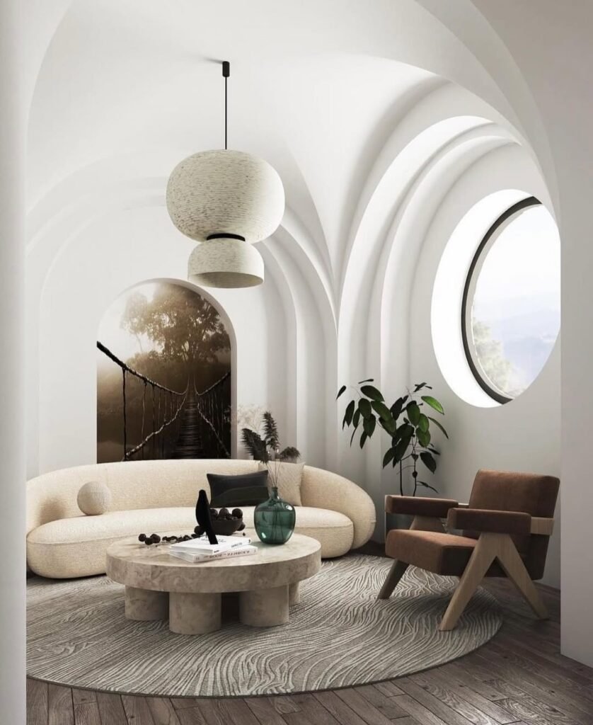 You need a professional stylist to balance all these arches and circles without the space looking like a geometry class gone wrong, but the trick is actually grounding that pale stone with deep, moody accents to create warmth.