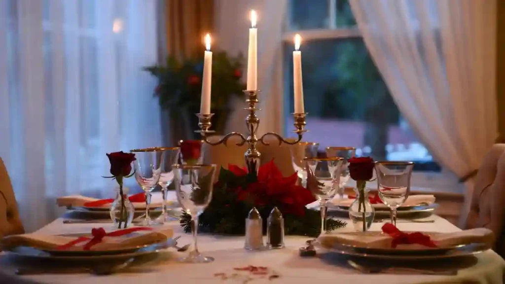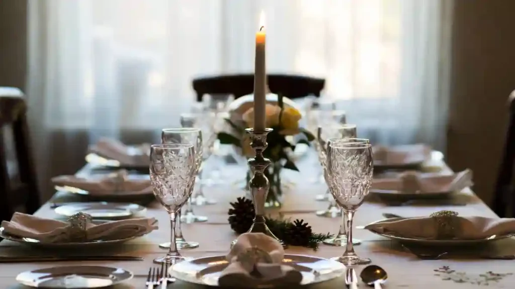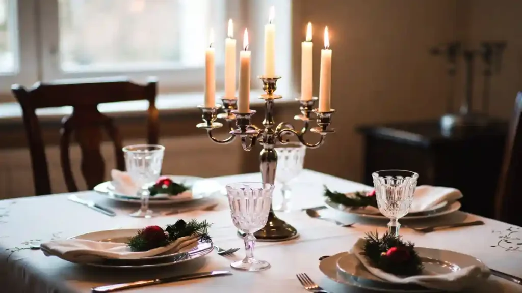 • Reflective surfaces amplify the mood: Polished silver holders and clear wine glasses catch the flickering candlelight, doubling the sparkle and making the room feel warmer and more inviting.
