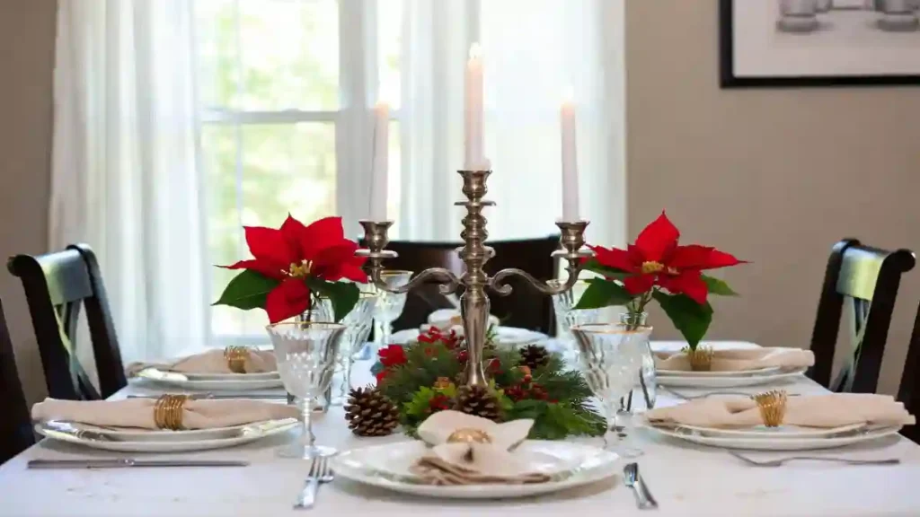 Flanking it with vibrant red poinsettias in small, clear vases is a brilliant move; they provide that essential pop of Christmas color without blocking conversation across the table.