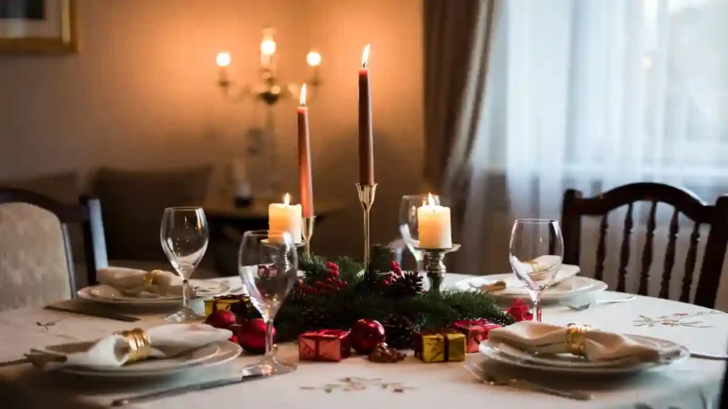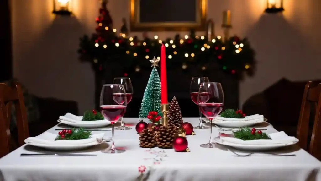 It is the reflection of the flames in the wine glasses or just the crisp white linens, but the whole setup feels perfect for a quiet, intimate Christmas Eve dinner rather than a loud party.