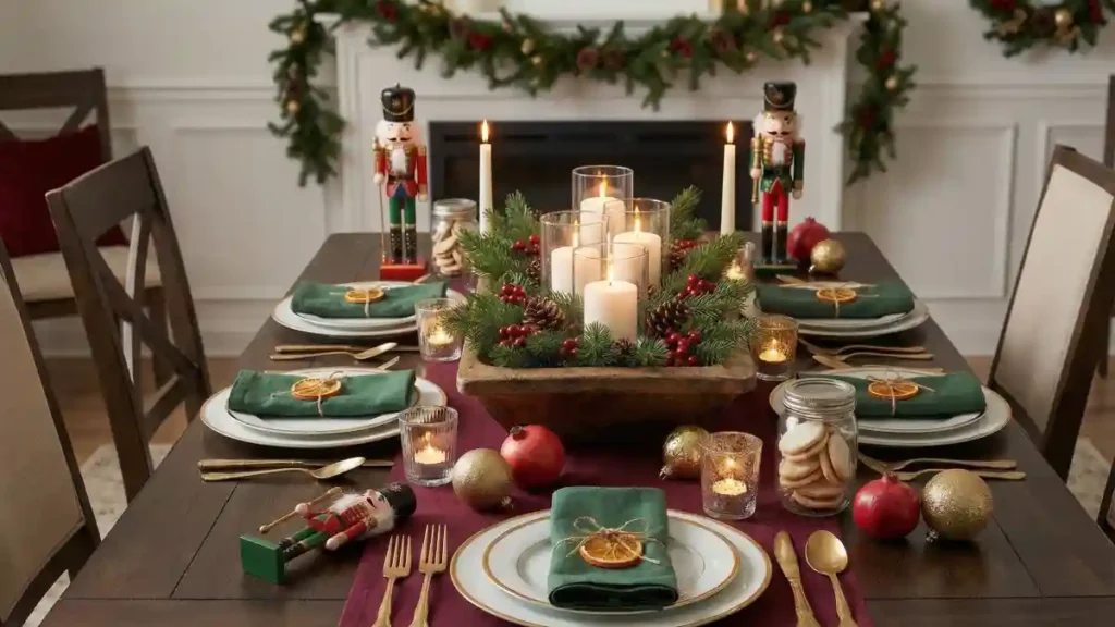 Standing guard among the feast, traditional nutcrackers bring a bit of whimsy that keeps the atmosphere joyful and relaxed, proving that high-end style can still feel cozy and approachable.