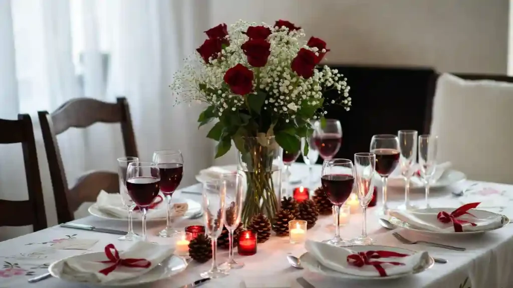 • Celebratory Glassware: Mixing champagne flutes with wine glasses immediately sets a festive, “toast-ready” mood.