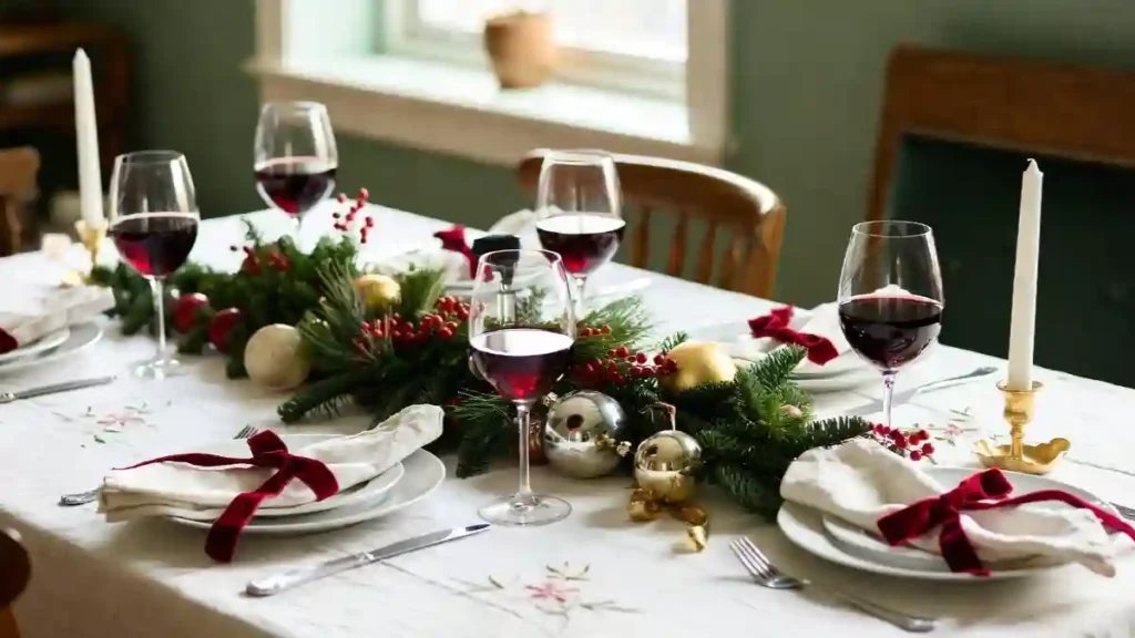 Bright natural light really changes the game for holiday meals, doesn’t it? Instead of heavy evening drama, sticking to a crisp white base makes those pops of red wine and green ribbons feel so fresh and inviting.