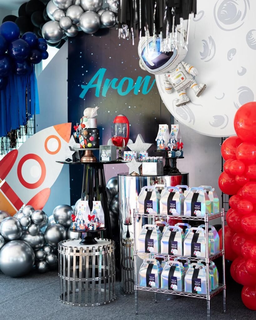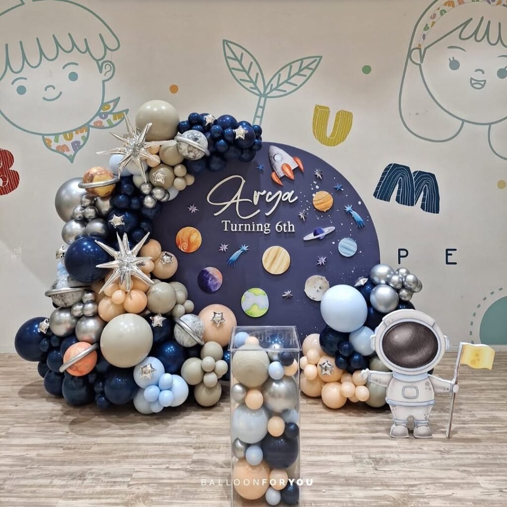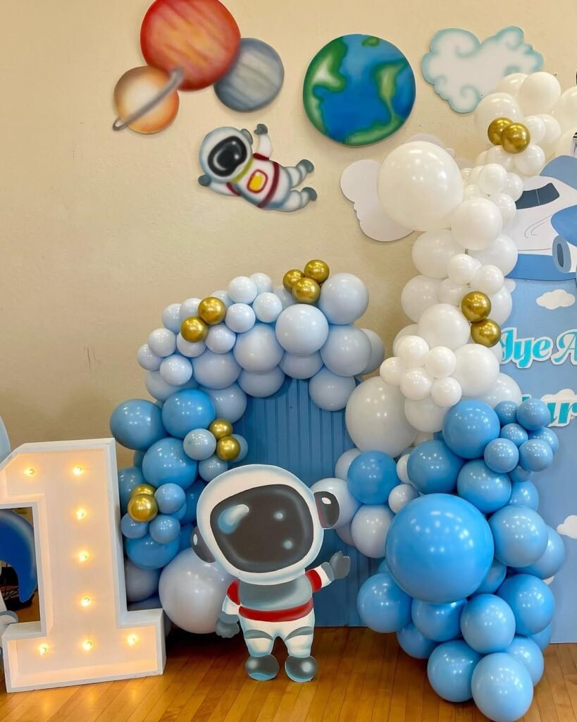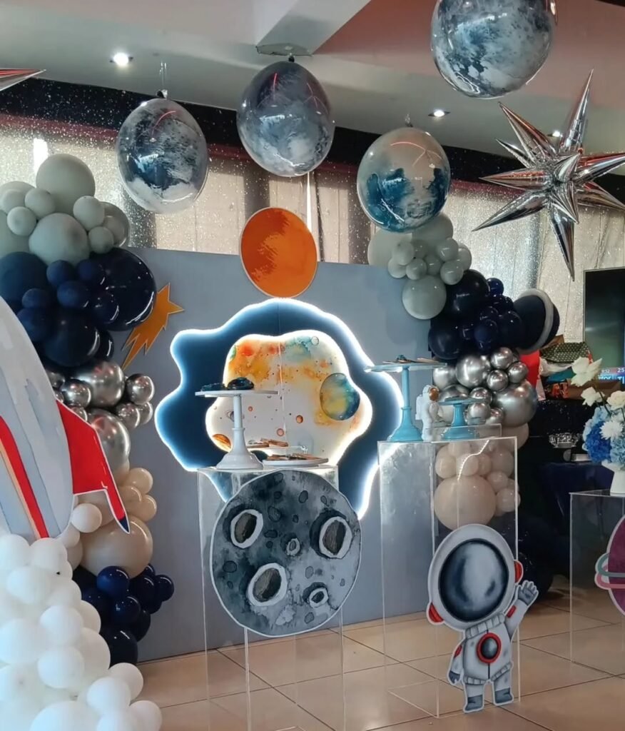 A giant astronaut balloon floating near the moon cutout adds that necessary whimsy without looking too childish.