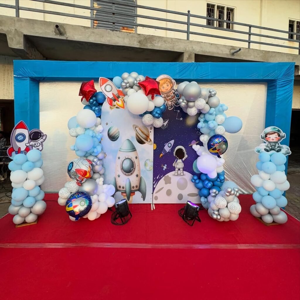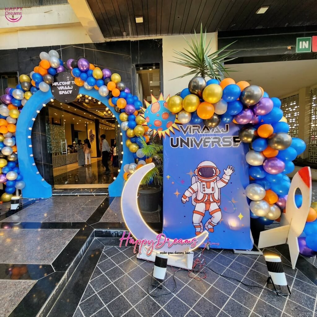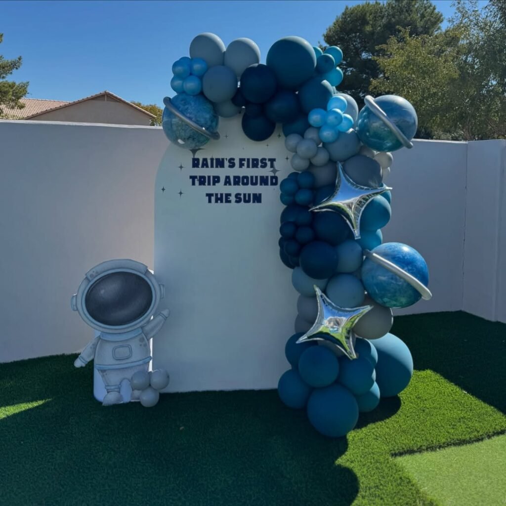 A giant astronaut balloon floating near the moon cutout adds that necessary whimsy without looking too childish.