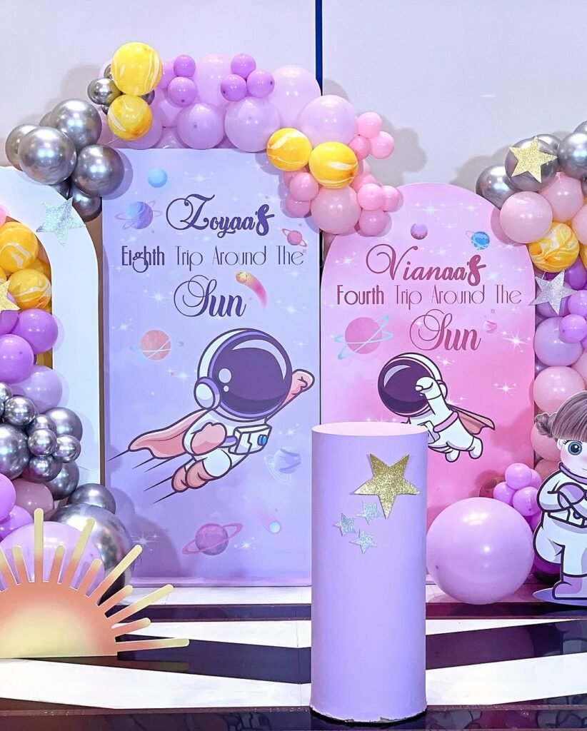 Even the custom character cutouts feature astronauts with matching pink and purple detailing, tying the whole “sister galaxy” look together beautifully.