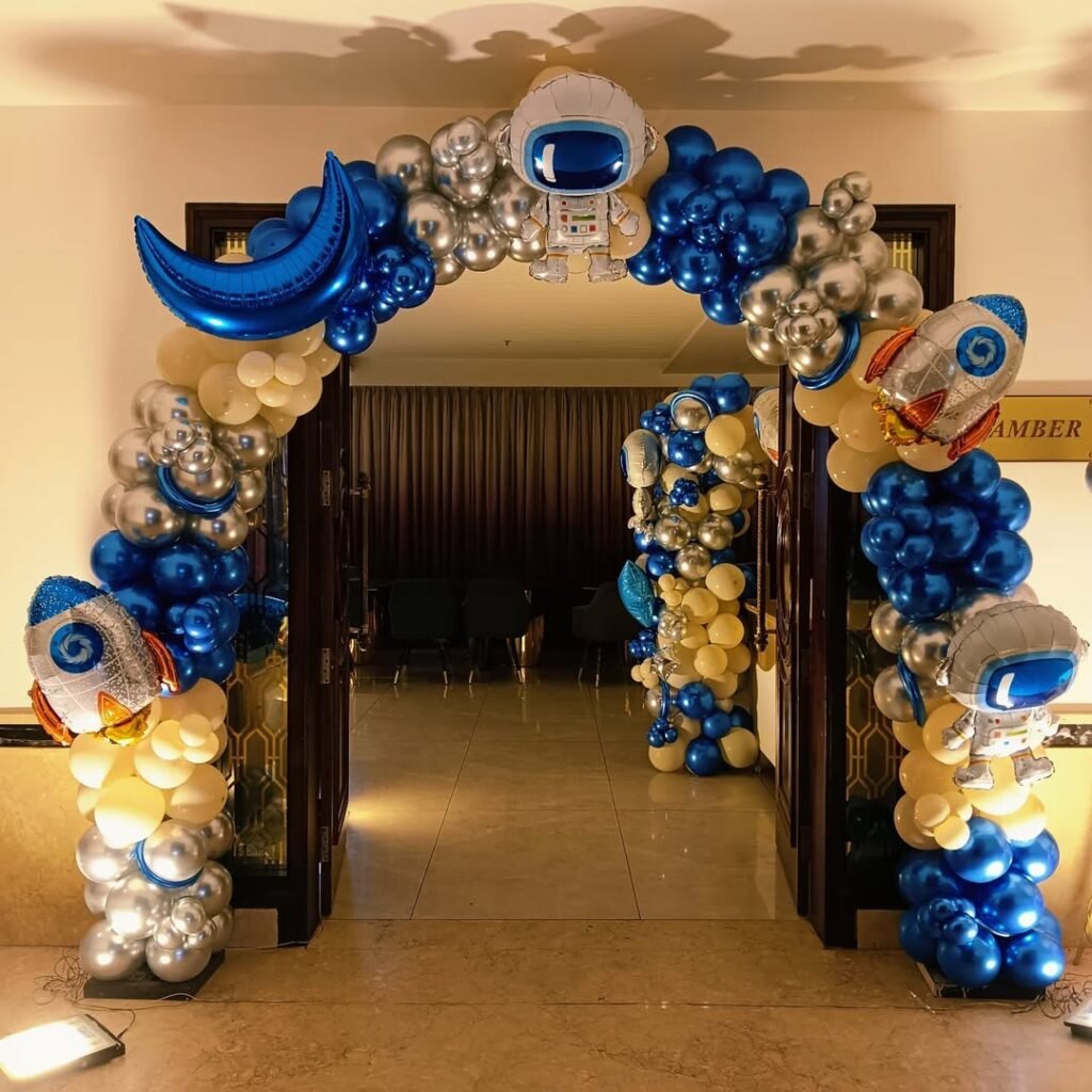 Creating a designated entry point using high-shine metallic balloons instantly signals to guests that they are leaving Earth behind the moment they step through the door.