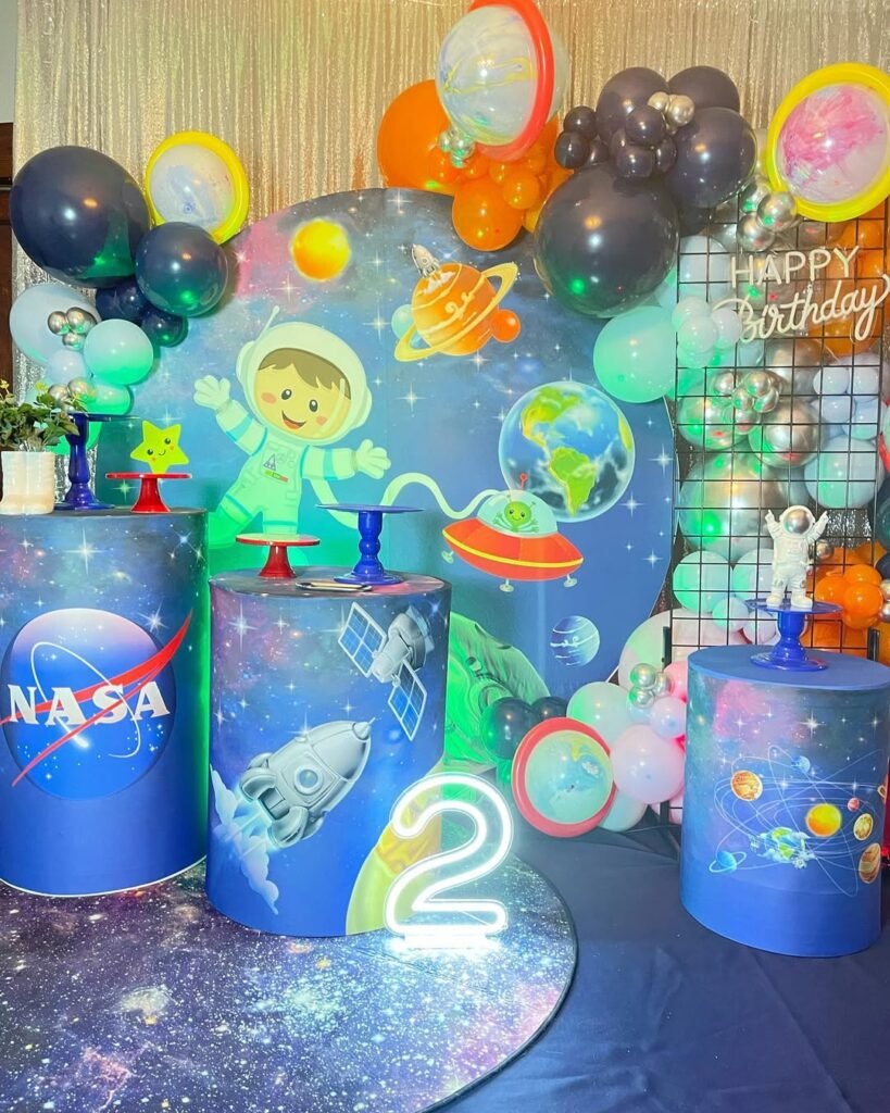 Adding a neon “Happy Birthday” sign against the starry night panel brings a modern, electric vibe, while the life-size astronaut cutout effectively invites kids to pose for their own moon landing photos.