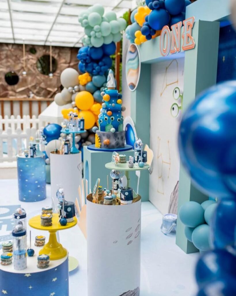 Stacked planets and playful astronauts climbing a gravity-defying cake turn a standard dessert table into a scene straight out of a sci-fi movie.