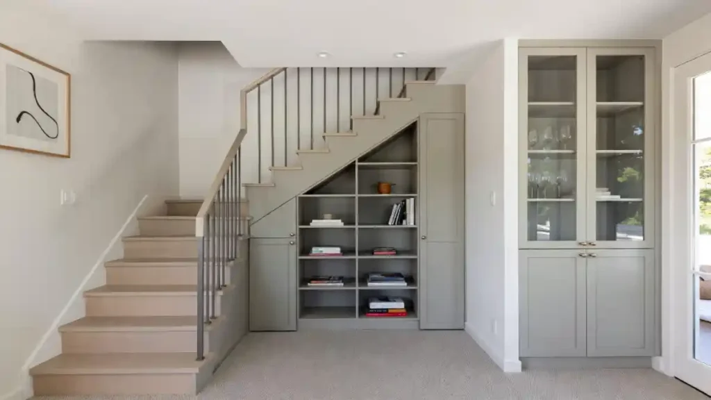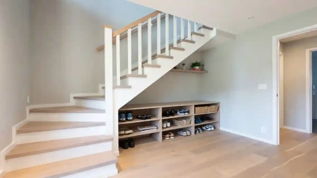 It functions like a walk-in pantry tucked neatly under the treads. Utilizing the full depth of the staircase ensures that even bulky seasonal items fit comfortably without cluttering the main living space.