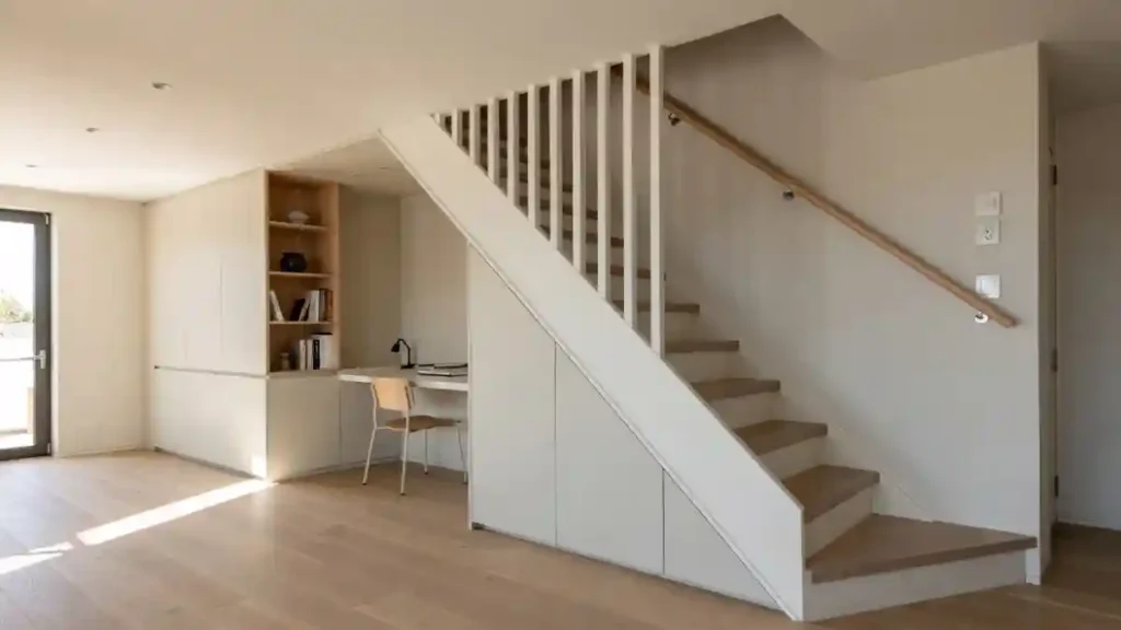 Tucking a sleek desk and shelving unit beneath the stair landing creates a dedicated zone for focus without encroaching on the living area.