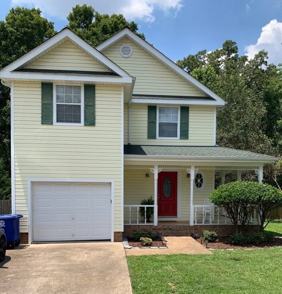 When a home features a vibrant color palette like sunny yellow siding paired with deep green shutters, the garage door needs to act as a visual anchor rather than a competitor.