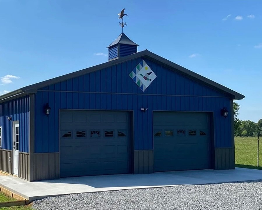 - Selecting doors that exactly match the vivid blue siding prevents the “visual clutter” often seen on large outbuildings, maintaining a clean and tidy appearance.
