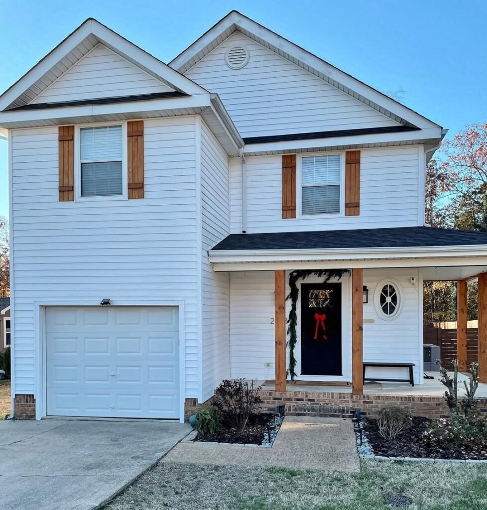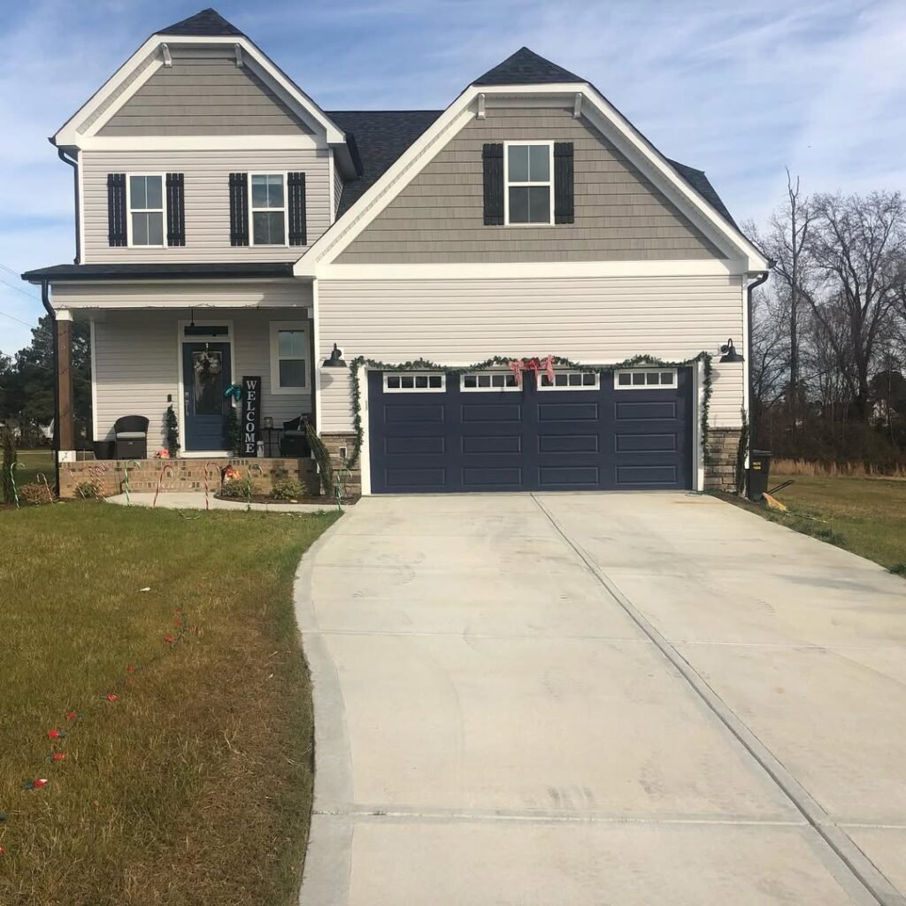 It adds a level of sophistication that coordinates effortlessly with the shutters and grey siding, proving you don’t need to rebuild your facade to get that custom home feel.
