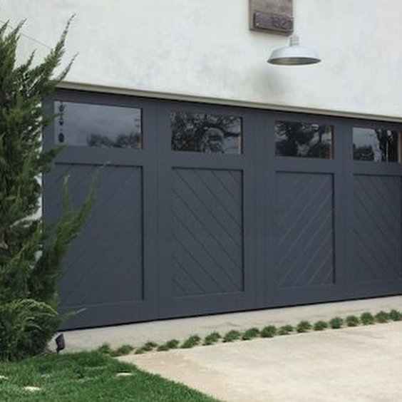 - Upper window panels allow natural light into the garage while breaking up the solid dark mass for visual balance.
