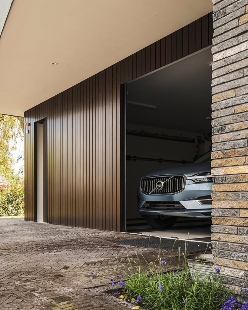 Hiding the garage door in plain sight is the ultimate modern luxury flex. Wrapping the entire wall in dark vertical cladding makes the entrance virtually disappear when closed, creating a seamless architectural line.