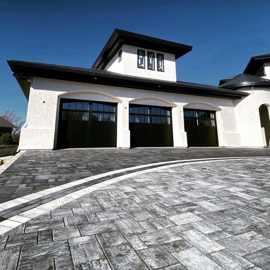 - Expansive paver driveways in cool grey tones complement the black doors, creating a cohesive visual path that leads the eye right to the entrance.