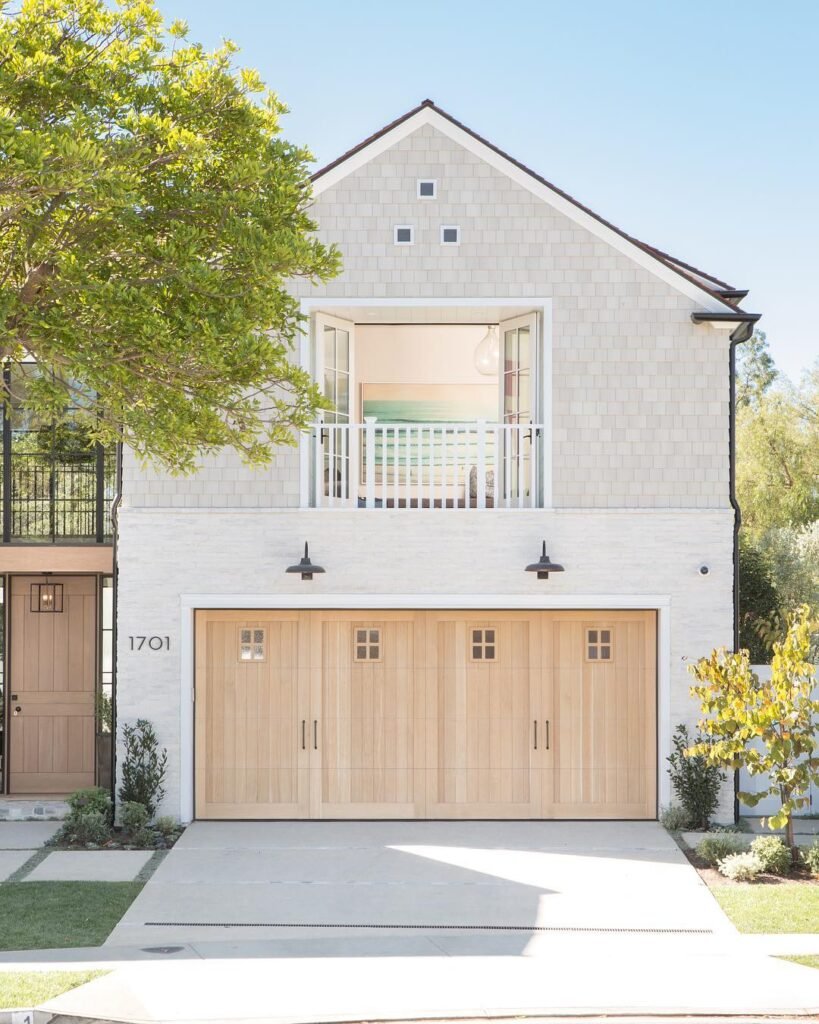 White houses are timeless, but sometimes they can feel a bit stark without the right accents. Introducing a large, light wood garage door instantly warms up the entire facade, making the home feel approachable and cozy.