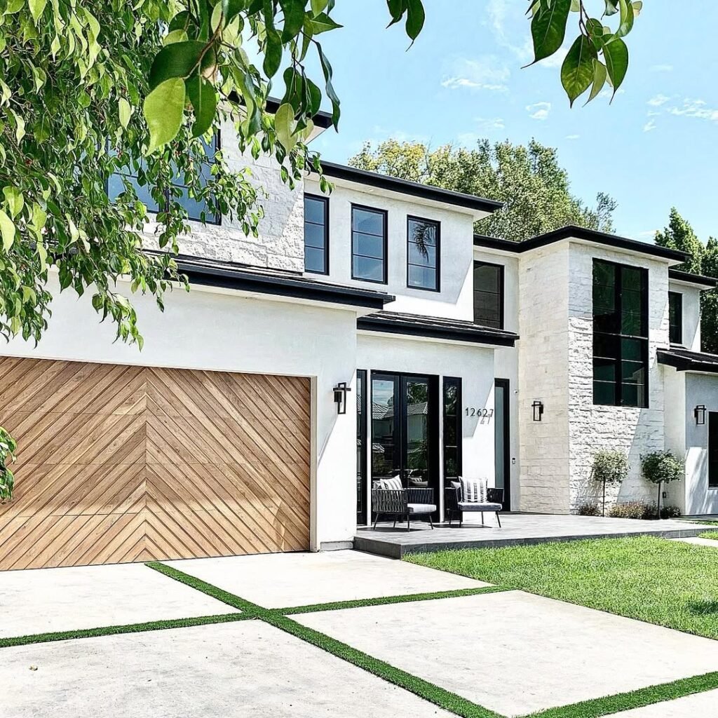Honestly, against that stark white stone and black trim, the warm wood tones prevent the house from feeling too clinical or cold.