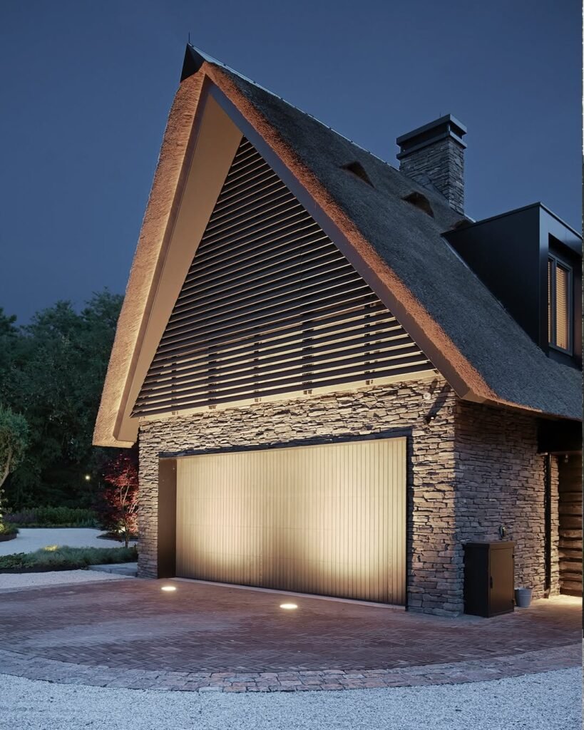 Lighting isn’t just for safety; it defines the architecture after dark. Placing a sleek, light-colored vertical slat door against rugged stacked stone creates a stunning interplay of textures that feels ancient yet hyper-modern.