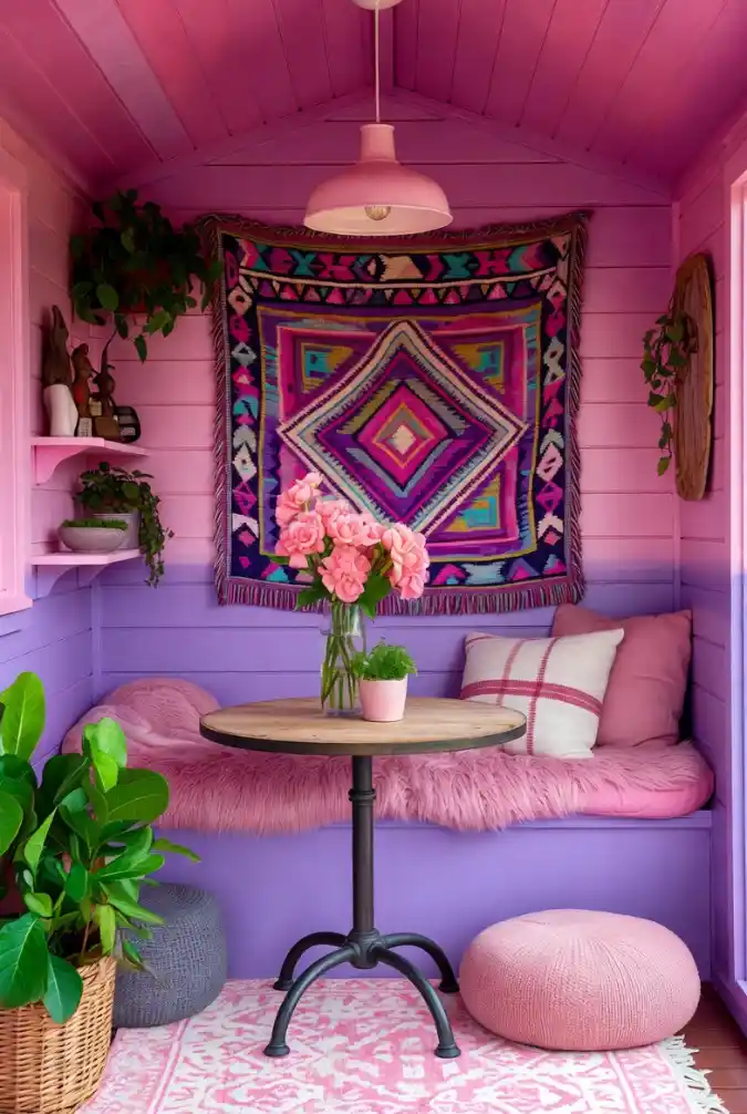 Bold hues define this cozy escape, transforming a simple structure into a vibrant retreat. The walls showcase a stunning ombré technique, transitioning smoothly from a bright pink ceiling down to a deep purple seating area.