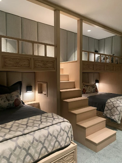 Wooden floating stairs provide a safe path to the upper twin sleepers. Individual silver sconces and power outlets are built into every corner for personal convenience. This design turns a large room into a high capacity guest suite with ease.