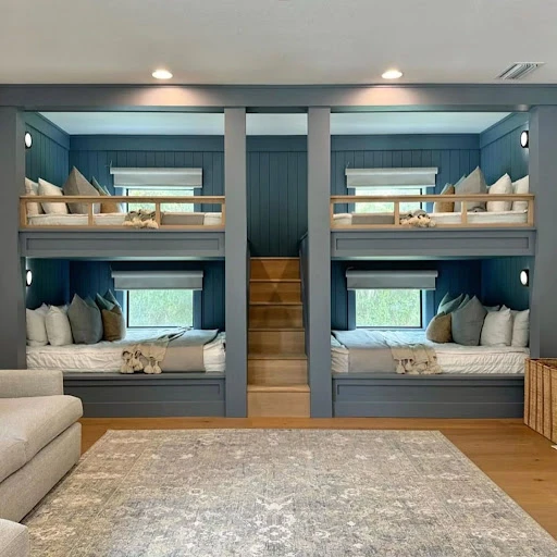 Natural wood railings contrast beautifully against the dark painted frame. Every bunk includes its own window and built in lighting for personal comfort. This grand design turns a single room into a high capacity guest suite.