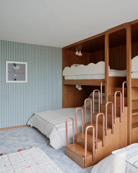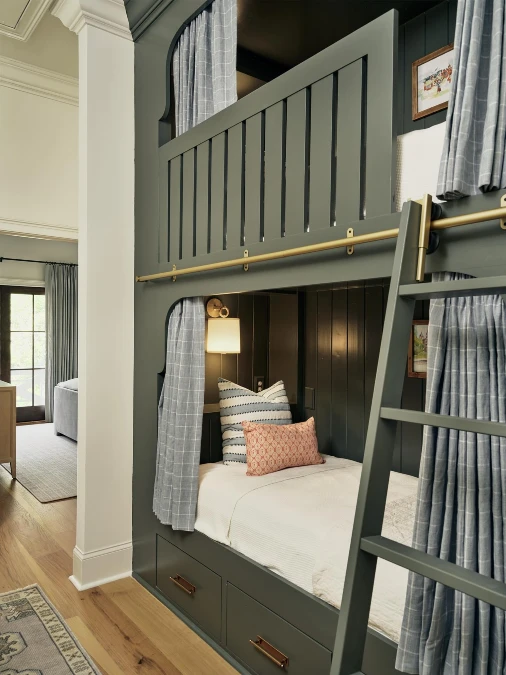 Drawers at the base feature copper pulls for extra storage of bedding or clothes. Each bunk contains a small wall lamp and electrical outlets for charging devices. This setup provides a high level of privacy in a shared room.