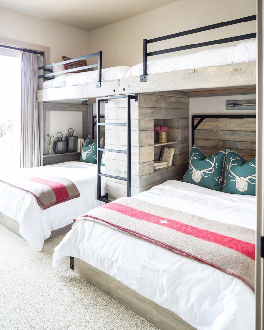 Black iron rails along the top bunk add a modern industrial touch to the weathered wood. Recessed wall niches provide a spot for books and decorative lanterns. Deer patterned pillows and red striped blankets give the room a cozy mountain lodge feel.