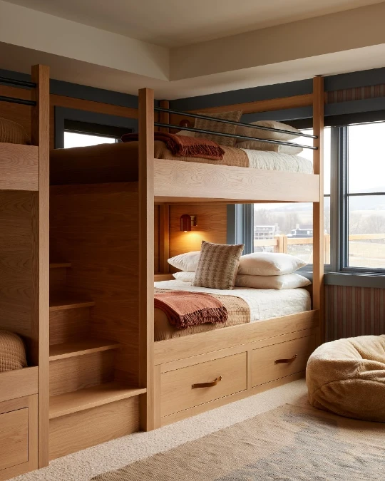 Light wood frames create a clean look for this shared sleeping space. A wide staircase sits in the middle for easy access to top levels. Padded wall panels add soft texture behind every bed.