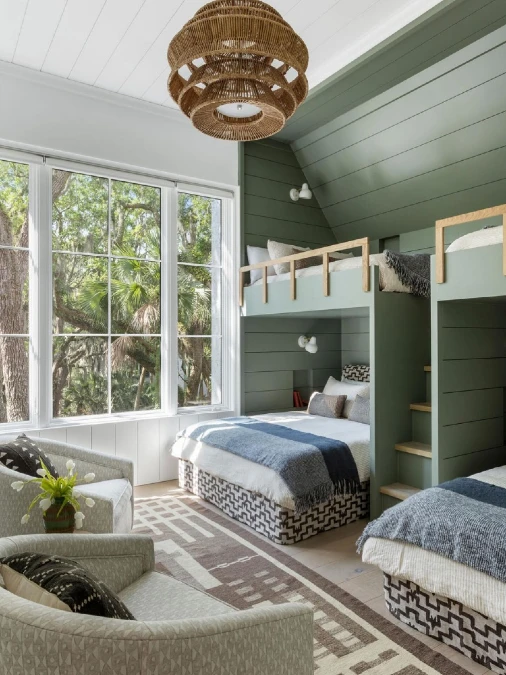 A vertical ladder attaches to the foot of the bed for a space saving climb. Soft sage green quilts and peach colored throws create a warm and inviting color palette. A woven jute rug on the dark wood floor grounds the entire sleeping area.