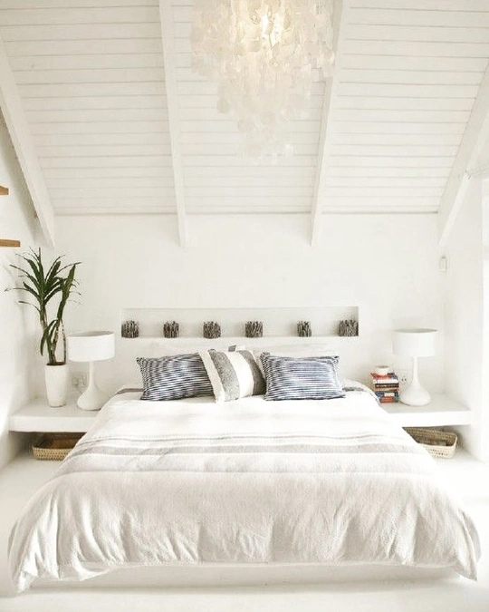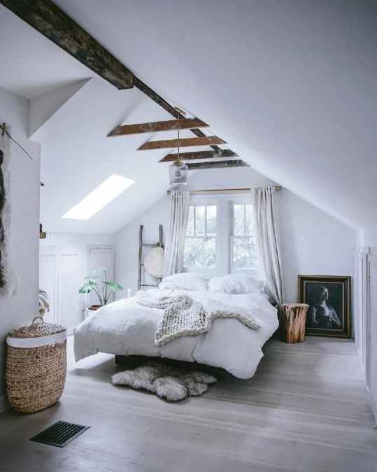 All-white walls and furniture create a seamless and bright look in this spacious attic suite. A tall ceiling with horizontal slats draws the eye upward and adds subtle texture to the room.