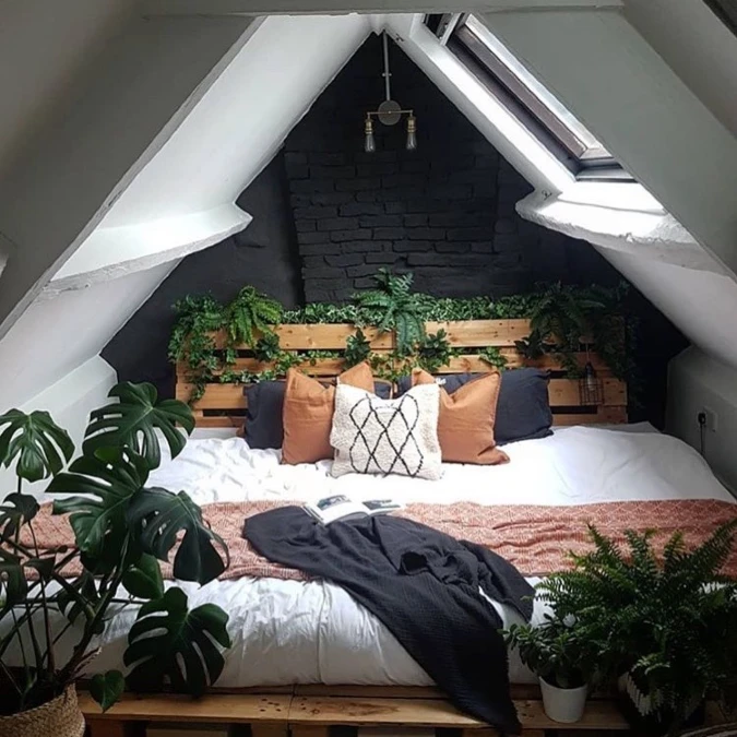 A black brick feature wall creates a dramatic backdrop for the pallet bed frame. Lush green vines drape over the wooden headboard to bring nature indoors.