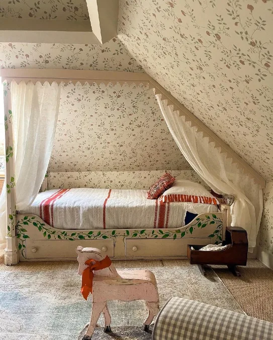 Floral vines climb up the frame of this custom daybed to match the delicate wallpaper. Scalloped edges and soft white curtains create a dreamy tent effect for a child.