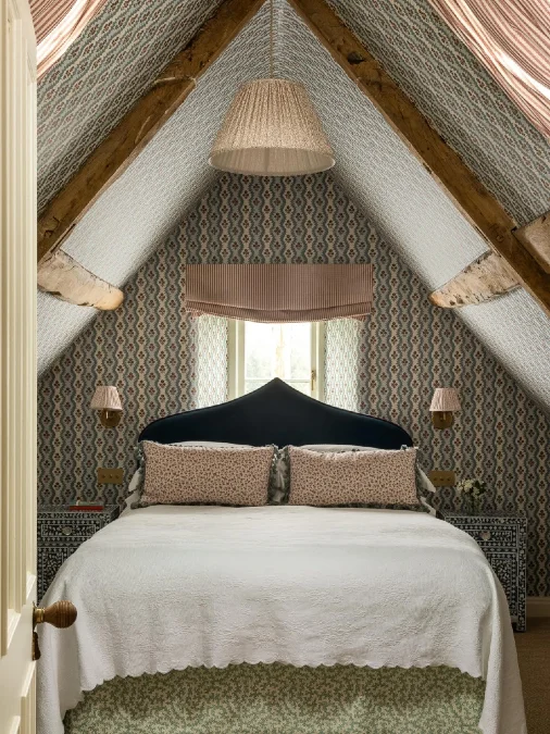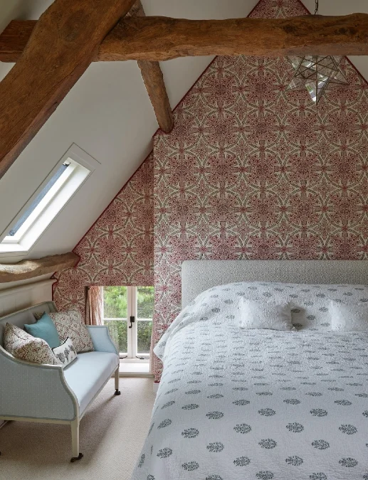 Intricate red and cream wallpaper covers the gable wall to create a bold focal point. Heavy timber beams cross the ceiling to add a sense of rustic strength to the room.