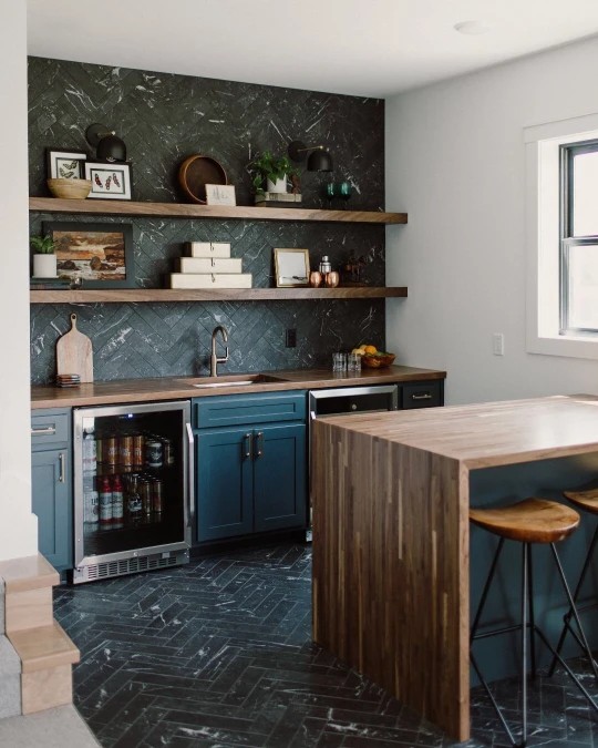 Deep teal cabinets anchor this sleek beverage station. Dark marble tiles arranged in a herringbone pattern create a stunning focal point.