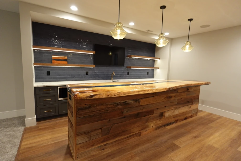 Reclaimed wood planks wrap the base of this impressive serving station. A glossy live edge countertop features a striking blue resin river flowing through the center.