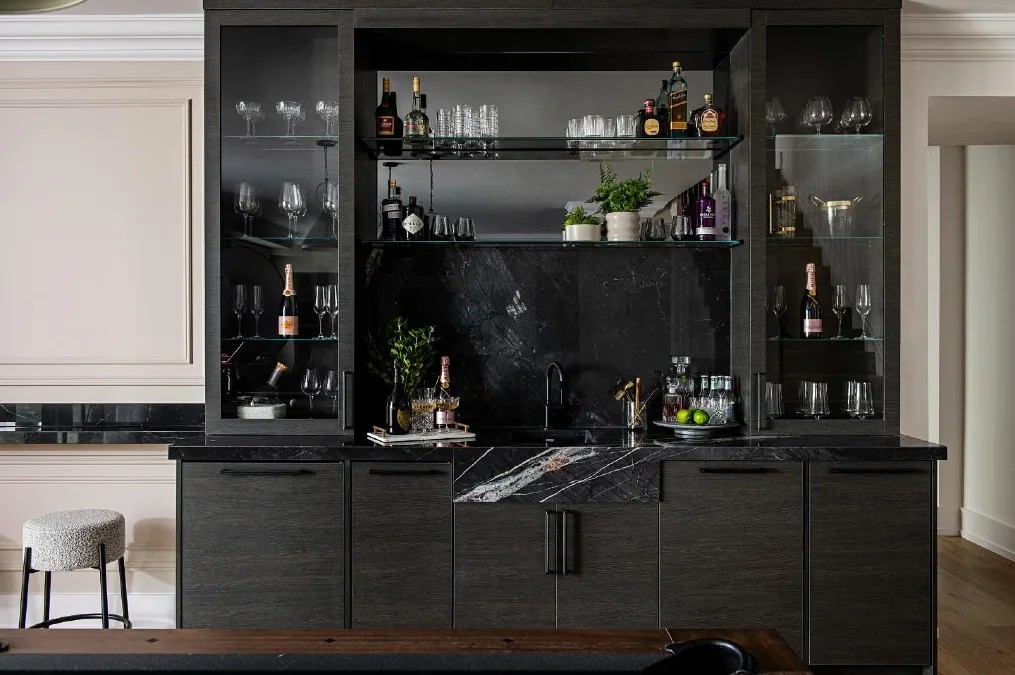Black marble countertops with white veining pair beautifully with deep wood cabinetry. Two tall glass display cases house delicate stemware and fine champagne bottles.