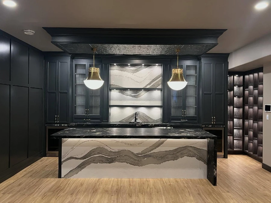 Dramatic black cabinetry frames a striking center feature with flowing grey and white patterns. This marbled design continues from the backsplash to the front of the large bar island.