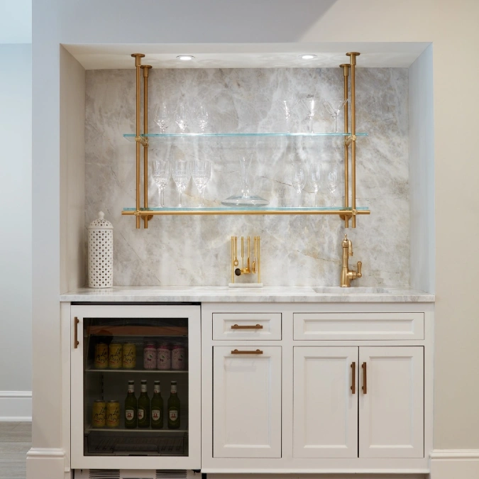 This compact beverage station fits perfectly into a recessed wall space. Gold hardware and a matching faucet provide a warm contrast against the cool marble backdrop.