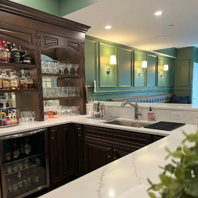 Dark wood cabinetry features ornate details and a mirrored back to reflect the glassware. A white quartz countertop provides a clean workspace for mixing drinks and serving guests.