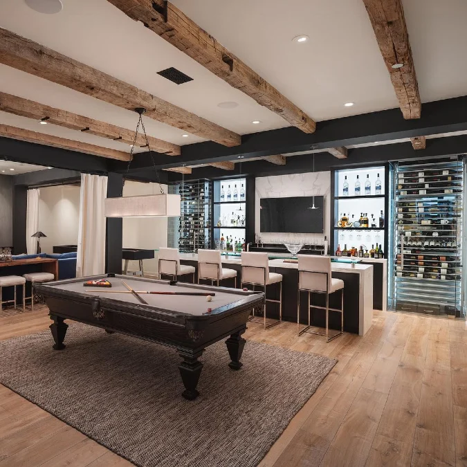 Rustic wood beams stretch across the ceiling to add warmth to this large entertainment space. A professional pool table sits on a grey rug as the room’s central activity.