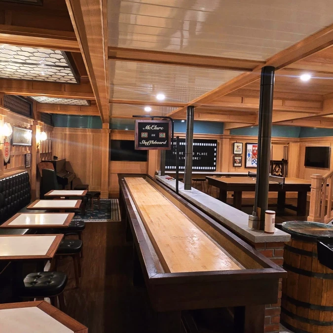 Light wood paneling covers the walls and ceiling to give this large basement a classic lodge feel. A long professional shuffleboard table serves as the main attraction for guests to enjoy.