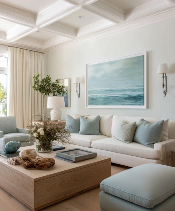 A coffered ceiling in a brighter white adds architectural depth. Soft blue pillows and a large ocean painting enhance the coastal vibe of the space.