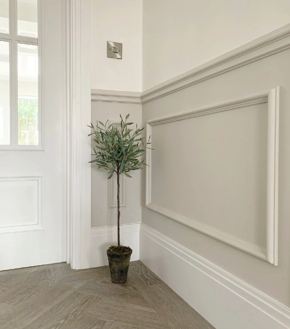 Crisp white trim highlights the detailed molding and adds sharp contrast. A small potted tree in the corner brings a touch of nature to this elegant corner.
