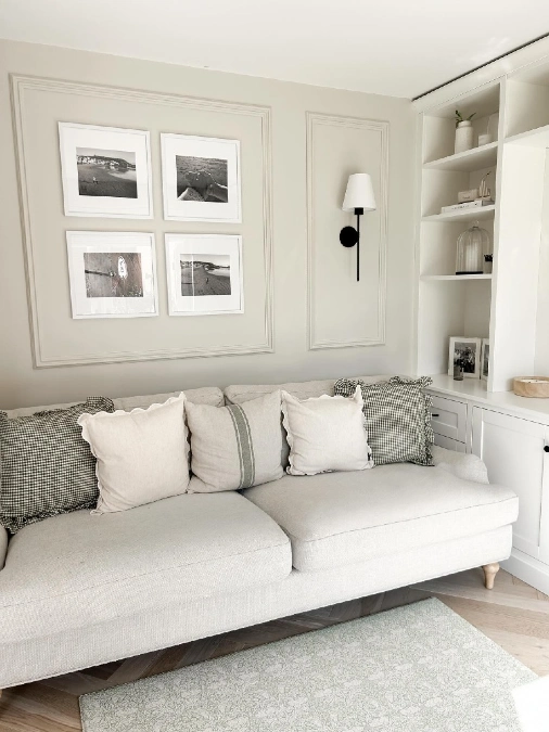 A neutral sofa sits against the paneled wall with checkered and striped pillows. Black and white photos in white frames create a personal touch above the seating.