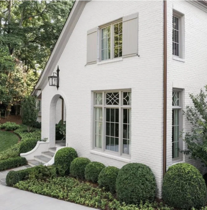 This home exterior features a painted white brick facade. The bright finish provides a clean look that pops against the lush green landscaping and manicured bushes.
