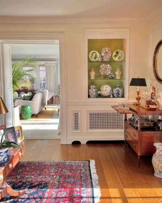 A green accent wall within the display cabinet creates a vibrant focal point. Rich wood floors and an oriental rug complete the timeless look of the space.